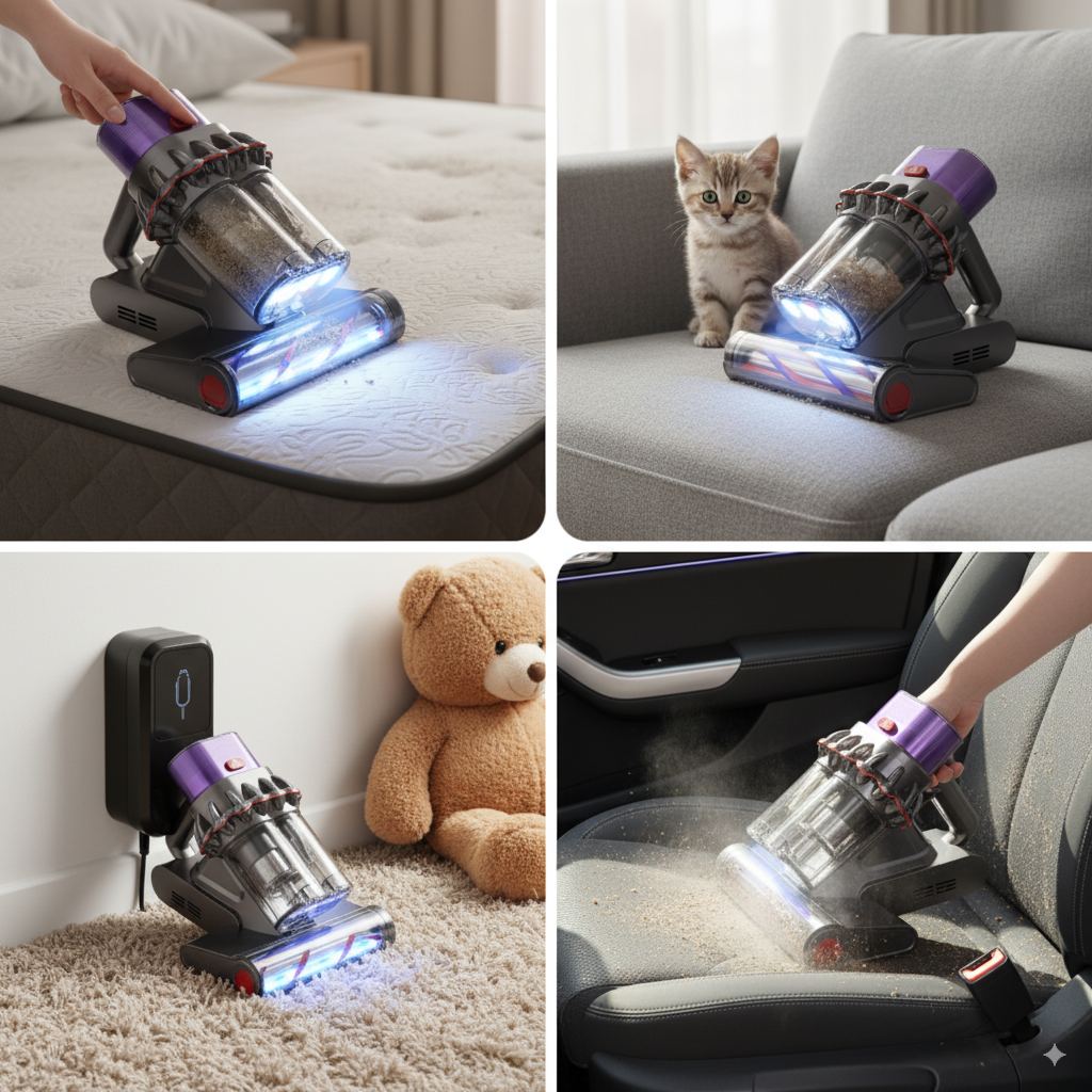 Il Zelto Pro combina aspirazione da 16.000Pa, luce UV-C sterilizzante e calore a 65°C per garantire una pulizia profonda di materassi, divani e tessuti.